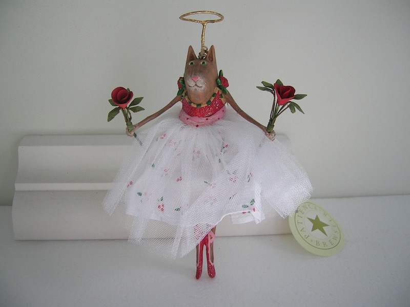 Katze aus Resin Grace Rose von Krinkles. Höhe 18 cm. Die Figur ist zum Hängen. Sie trägt ein weisses Kleid mit rosa Blümchen. Darüber ist ein Spitzenrock. Das Oberteil ist rosa. An den Füßen hat sie Ballettspitzenschuhe in rot mit rosa Bändchen. Die Ohrringe sind rote Rosen. In jeder Hand hat Grace Rose eine rote Rose. Be my Valentine. Über dem Kopf schwebt ein goldener Heiligenschein. Alles ist von Patience Brewsters.