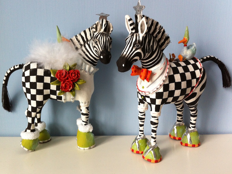 Aus der Jambo Kollektion Zebra Zeke und Zelda aus Resin. Der Preis gilt pro Stück. Zelda mit grünen Schuhen, roten Rosen am Kragen und Vogel auf dem Rücken. Zeke trägt Schachbrettmuster Kleid mit oranger Fliege. Er hat ebenfalls einen Vogel auf dem Rücken und einen Stern auf dem Kopf.